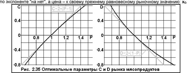 Подставив в уравнение динамики массы оптимальное значение: х(т) = X0 + D»a*Exp(-A*T), и предельные значения: N(t) = Nn M(T) = Mo, проведя интегрирование в пределах [0 < т < °°), после аналогичных предыдущему преобразований, получим для определения параметра: D уравнение: D*P = [1 - Exp(-D)]. Решение этого уравнения: D = D(P) приведено на Рис. 2.35 справа. Для значений: P ~ 1 - справедлива в первом приближении линейная аппроксимация: D(P) « 2·(1 - Р), а практически идеально кривую: D(P) аппроксимирует такое выражение: D(P) = 2·(1 - Р)/Р °·6767. Из предпоследнего уравнения следует, что при увеличении поголовья на: 100·(Ρ - 1)% падение цен должно быть равным: 2·(1- Р)»а (или, как и ранее, удвоенному проценту от оптимальной прибыли продавцов), а далее сходиться по экспоненте к нулю, а цена, соответственно, стремиться к своему прежнему равновесному рыночному значению: хо.