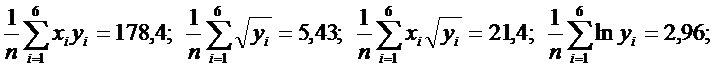 По виду выборки достаточно очевидно, что связь между х и у скорее всего не является линейной – у растет не пропорционально х. Проверим это предположение, найдя коэффициенты а и b для каждой из функций. Для этого вычислим предварительно