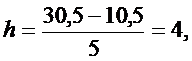 и (a, b) разбивается на части (10,5; 14,5), (14,5; 18,5), (18,5; 22,5), (22,5; 26,5) и (26,5; 30,5). Статистический ряд при этом имеет вид: