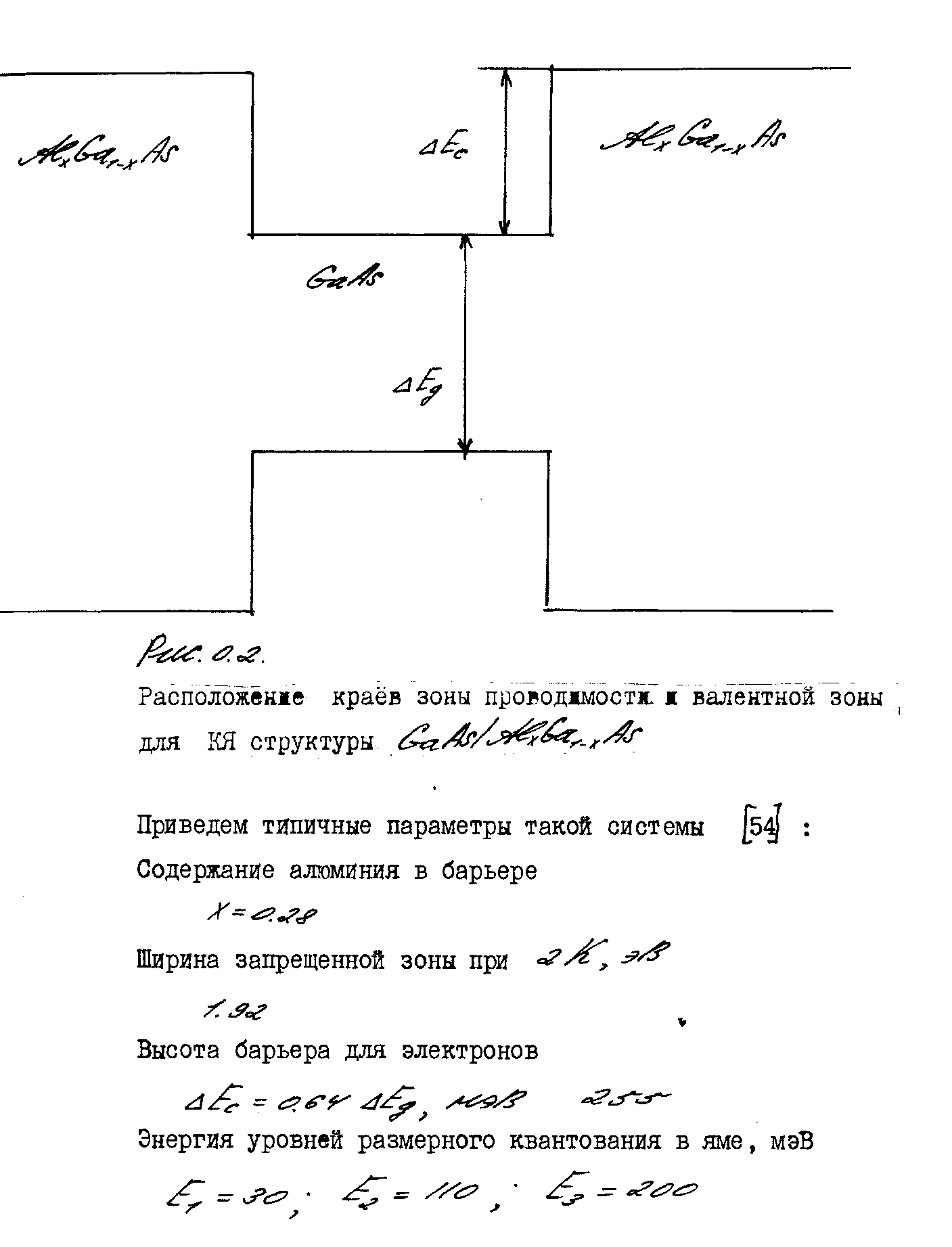 Т.к. теоретический анализ энергетического спектра электронов в многослойных структурах и сверхрешетках(СР) опирается на соответствующую модель потенциала, рассмотрим подробнее наиболее широко используемую нами в дальнейшем модель. Это модель т.н. одиночной квантовой ямы (КЯ), типичным примером которой является двойной гетеропереход (рис.0.2). Ряд физических свойств КЯ (в частности транспортные свойства в плоскости слоя) во многом аналогичны свойствам полупроводниковых CP при большой толщине квантового барьера. При технологически актуальных величи-