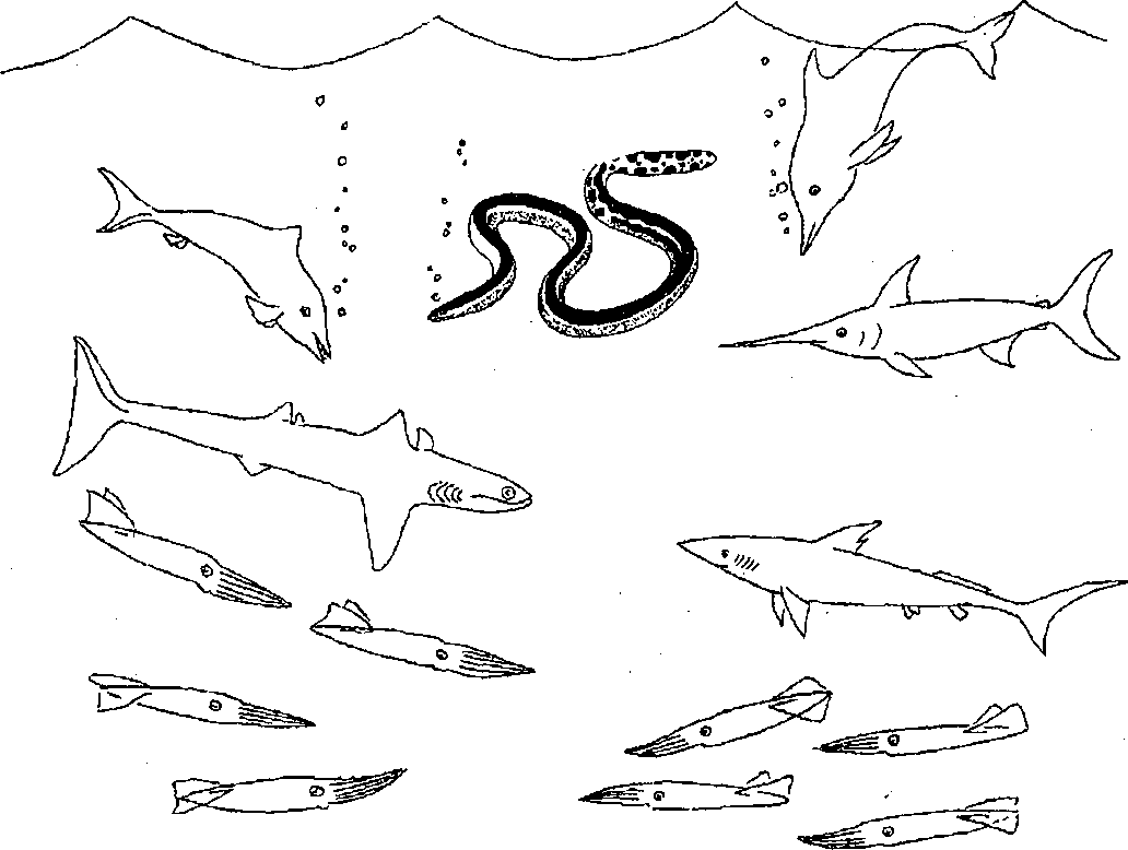 Рис. 1. Жизненная форма активного хищника макрофага в сообществе биотопа океанской эпипепагиапи: справа — совместно сосуществующие организмы, слева — не сосуществующие (вымершие) совместно обитавшие в прошлом организмы (ихтиозавр, белемниты,