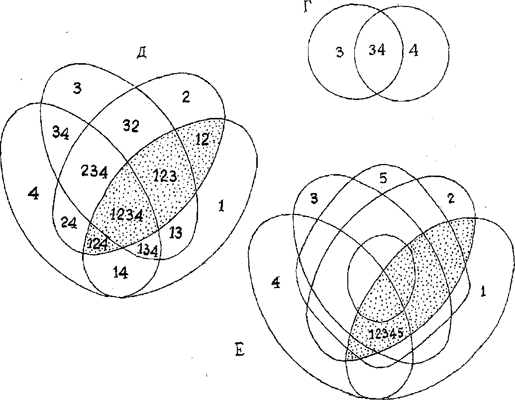 Рис. 2. А-Д — шаги 1-5 логического деления генеральной совокупности организмов; каждый шаг — это установление межорганизменных отношений. Е — пять пересекающихся фигур — четыре овала (1-4) и «продырявленная пластинка» (5) образуют диаграмму Венна (Примечание 5). Она означает результат логического деления одной и той же генеральной совокупности организмов всеми возможными способами (общее число способов (25-1), 1 означает окружающую плоскость, не существующие организмы генеральной совокупности)