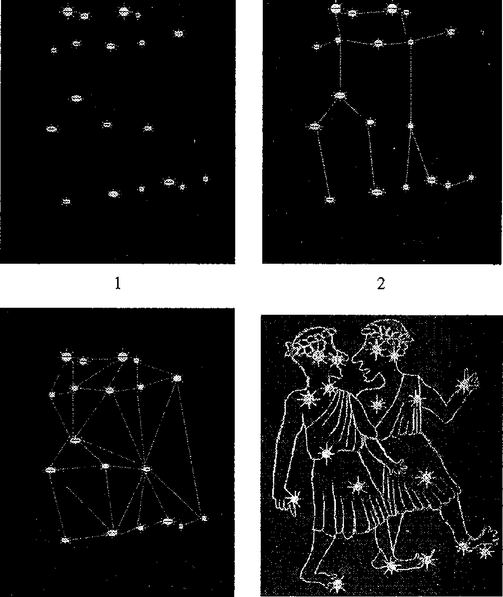 Рис. 7, 1 — Близнецы — группа звезд; 2 — Близнецы как двоичные числа; 3 — Близнецы как троичные и четверичные числа (триангуляция); 4 — Близнецы как мифологический образ (по: Рей 1969)