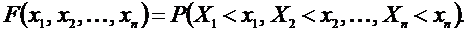 Определение. Функцией распределения n-мерной случайной величины (X1, X2, …, Xn) называется функция F(x1, x2, …, xn), выражающая вероятность совместного выполнения n неравенств X1 < x1, X2 < x2, …, Xn < xn, т.е.