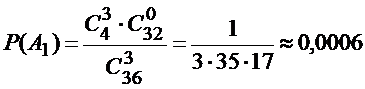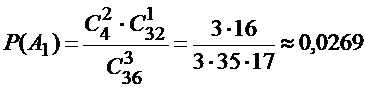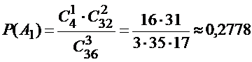 Пример 1. Из колоды карт (36 карт) наудачу вынимаются три карты. Найти вероятность того, что среди них окажется точно один туз.