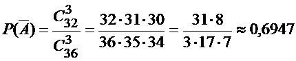 Пример 2. Из колоды карт (36 карт) наудачу вынимаются три карты. Найти вероятность того, что среди них окажется хотя бы один туз.