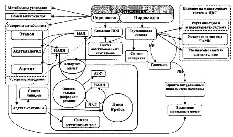 Рис. 19. Схема влияния метадоксила на основные биохимические процессы при острых отравлениях алкоголем (Бонитенко Е. Ю., 2004) ЛЕЧЕНИЕ ОСТРЫХ ИНТОКСИКАЦИЙ АЛКОГОЛЕМ течение 3—5 дней. При ОАИ, а также в случае развития в постинтоксикационном периоде делириозных состояний и выраженных явлениях гепатопатии препарат вводится внутривенно в дозе 1200—1500 мг в течение 5—7 суток с проведением в дальнейшем поддерживающей пероральной терапии до 3-х месяцев. Нами (Бонитенко Е. Ю., Васильев С. А.) было проведено клинико-экспериментальное исследование влияния медиаторных и метаболических препаратов на течение, исход и показатели токсикокинетики этанола при острых отравлениях алкоголем тяжелой степени. Для проведении экспериментальной части работы нами были выбраны: налоксон — «чистый» опиатный антагонист, лишенный морфиноподобного действия, аминостигмин — обратимый ингибитор холинэстеразы преимущественно центрального действия, пикамилон — ГАМК-эргический препарат из группы ноотропов и метадоксил — как средство метаболической терапии. Опыты выполнены на белых крысах-самцах массой 140—180 г, которым этанол вводился однократно внутрибрю- шинно в дозе 1,0ЛД50 (соответствующей отравлению алкоголем крайне тяжелой степени). Лабораторные животные были разделены на 6 групп: первая — контрольная; второй вводился аминостигмин (0,05 мг/кг); третьей — метадоксил (100 мг/кг); четвертой — налоксон (0,05 мг/кг); пятой — пикамилон (300 мг/кг); шестой — кофеин (30 мг/кг) совместно с кордиамином (60 мг/кг). Применение пикамилона и, особенно, аналептиков увеличивало количество летальных исходов до 70 и 100% по сравнению с контролем (60%). В то же время в группах, получавших аминостигмин или налоксон, летальность была ниже, чем в контроле — 30 и 40% соответственно, а у получавших метадоксил составила 25%. После введения метадоксила наблюдалось быстрое восстановление активности животных, не сопровождавшееся в дальнейшем феноменом рикошета. В свою очередь через несколько минут после введения аналептиков у животных появлялись слюнотечение, двигательная активность (умывательные движения передних конечностей), дыхание становилось глубоким и частым, наблюдалось появление корнеального и роговичного рефлексов при отсутствии болевой чувствительности. В дальнейшем двигательная активность снижалась, рефлекторная активность угасала, дыхание становилось глубоким и редким, после чего следовала гибель животных. В отличие от аналеп- тиков в группе, получавшей налоксон, после первоначального выраженного пробуждающего эффекта препарата на 5—6 час с момента затравки наблюдалось резкое снижение активности животных с развитием повторной комы, которая в 20% случаев заканчивалась их гибелью. В других группах (контрольной, получавшей пикамилон и аминостигмин) гибель животных наблюдалась только на высоте токсического действия этанола (первичной комы), то есть вскоре после затравки; повторно кома не развивалась. Применение аминостигмина также уменьшало время пребывания животных в боковом положении, но его эффективность в этом отношении была ниже, чем у метадоксила и налоксона. Все использованные нами препараты практически не оказывали влияние на концентрацию этанола и продуктов его метаболизма в крови. Только в группе, получавшей метадоксил, было зарегистрировано достоверное снижение