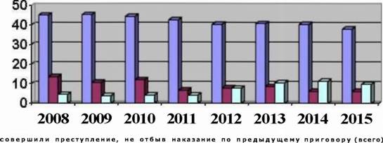 12,7% (117 697 чел.) - это осужденные, совершившие преступления при наличии неотбытого наказания по предыдущему приговору, в 2009 г. этот показатель составил 13,7% (122 606 чел.), в 2010 г. - 14,05% (118 792 чел.), в 2011 г. - 14,08% (258 301 чел.), в 2012 г. - 13,9% (102 676 чел.), в 2013 г. - 14,4% (105 887 чел.), в 2014 г. - 14,1% (101 600 чел.), в 2015 г. - 12,5% (91 456 чел.).Среди осужденных, имеющих неснятую или непогашенную судимость, удельный вес «наказательной» или «пенальной»436 преступности составил: в 2008 г. - 45,1%, в 2009 г. - 45,3%, в 2010 г. -44,4%, в 2011 г. -42,7%, в 2012
