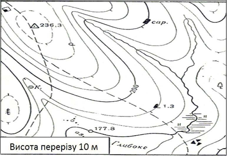 Відносні висоти схилів і глибини лощин зручно визначати за кількістю проміжків між горизонталями на схилі і помноживши його на висоту перерізу, отримаємо відносну висоту схилу. Наприклад, на південно-західному схилі висоти з відміткою 236,3 м, рис.1.34, є три проміжки між основними горизонталями і один між основною і додатковою горизонталями. Висота перерізу 10 м, тому відносна висота схилу буде 3,5