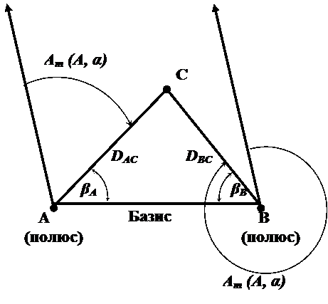 Линейными величинами служат расстояния (дальности) до определяемой точки от полюсов, а угловыми величинами могут быть истинные или магнитные азимуты, дирекционные углы, а также углы направления. Углы направления (βА и βВ) измеряют от линии (базиса), соединяющей полюсы.