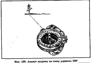 предмета і зорієнтувати компас, потім, утримуючи компас в орієнтованому положенні, встановити візир так, щоб візирна риска — проріз — мушка збігалися з напрямом на місцевий предмет (мал. 198). У цьому положенні позначка на лімбі проти покажчика біля мушки — це величина прямого азимута на місцевий предмет.