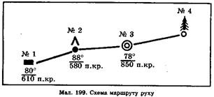 Коли переходять від одного пункту до другого, то дотримуються напряму на орієнтири, а відстань підраховують «у парах кроків». На початкових зворотних пунктах за визначеним азимутом за допомогою компаса знаходять напрям руху. В цьому напрямі вибирають і залам "ятовують або більш віддалений орієнтир (допоміжний), або розміщений ближче до зворотного пункту маршруту руху (проміжний) орієнтир. Якщо з проміжного орієнтиру не. видно зворотного пункту, то визначають наступний орієнтир.