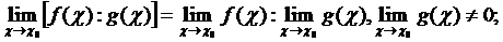 ▫ Предел отношения равен отношению пределов, если предел знаменателя отличен от нуля: